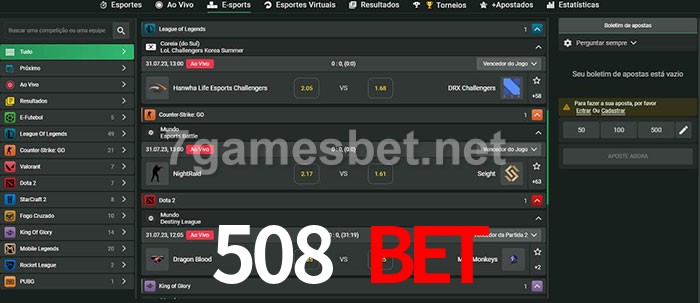 O 508 Bet oferece uma grande seleção de opções de apostas em e-sports com probabilidades competitivas